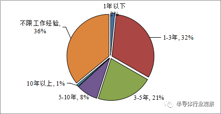相对于欧美发达*,我国集成电路人才的培养和沉淀相对滞后。企业为了满足自身的需求,通常会降低对人才工作年限的要求。2017-2018年的集成电路产业人才需求数据表明,有36%的企业对从业人员的工作年限没有要求,32%的企业要求1-3年的工作经验。由于我国拥有10年及以上工作年限的从业人员较少,对10年及以上工作年限的要求仅占1%。